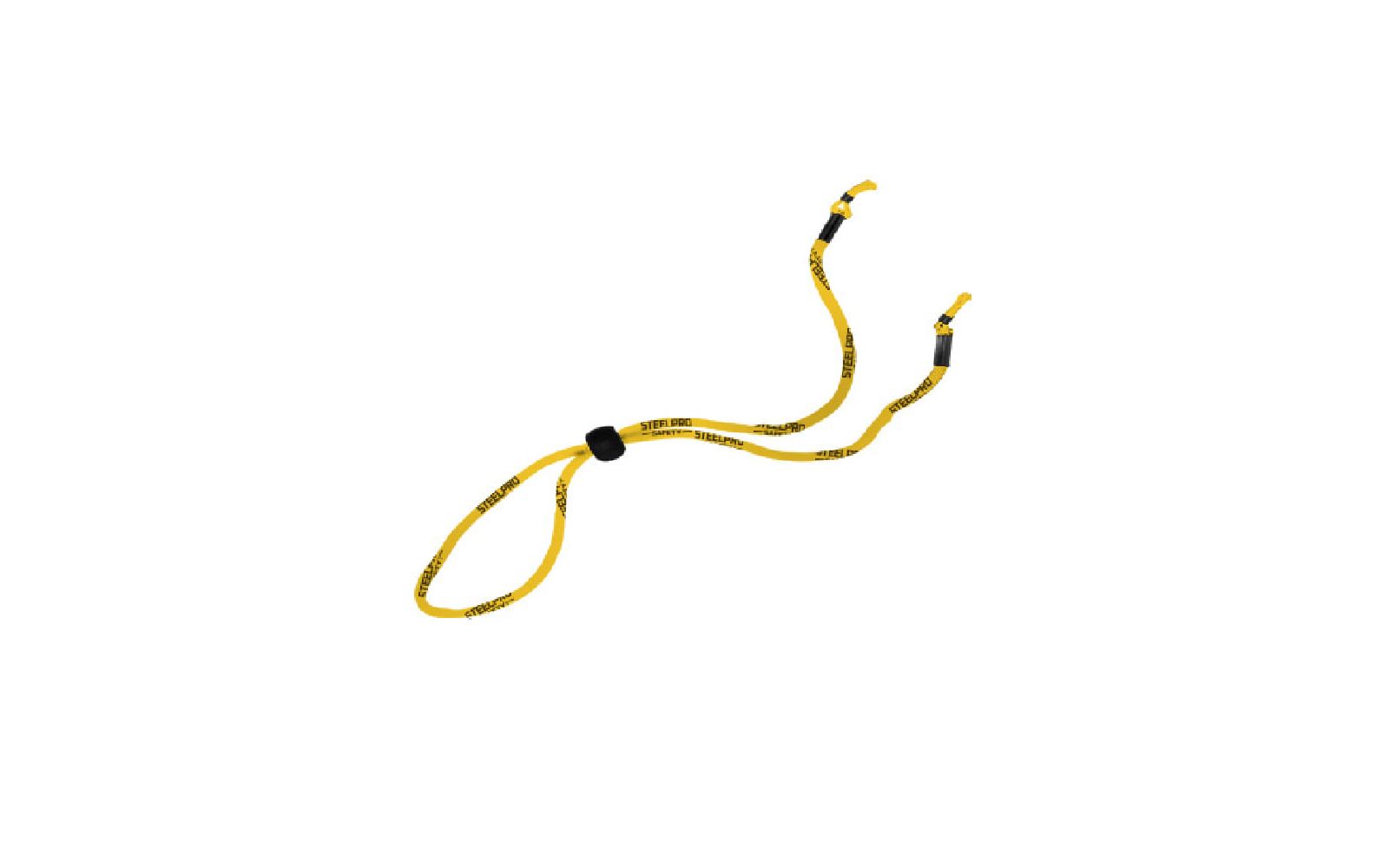 Cordón Steelpro amarillo, mide 60 cm hecho en polipropileno trenzado de alta tenacidad que ayuda al posicionamiento perfecto del lente al cuello, además posee un dispositivo de ajuste que permite controlar el largo de la pieza, posee un encastre adaptativo para una gran variedad de patillas de anteojos.