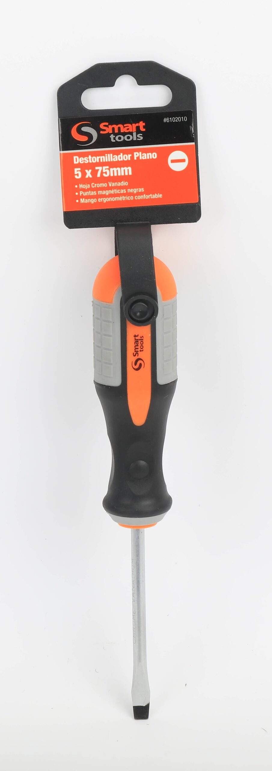 Destornillador plano 5x75mm ( 3/16″ x 3″) mango tricolor, vara de cromo vanadio, punta magnetica, dureza >HRC48, mango ergonomico tricolor PP+TPR