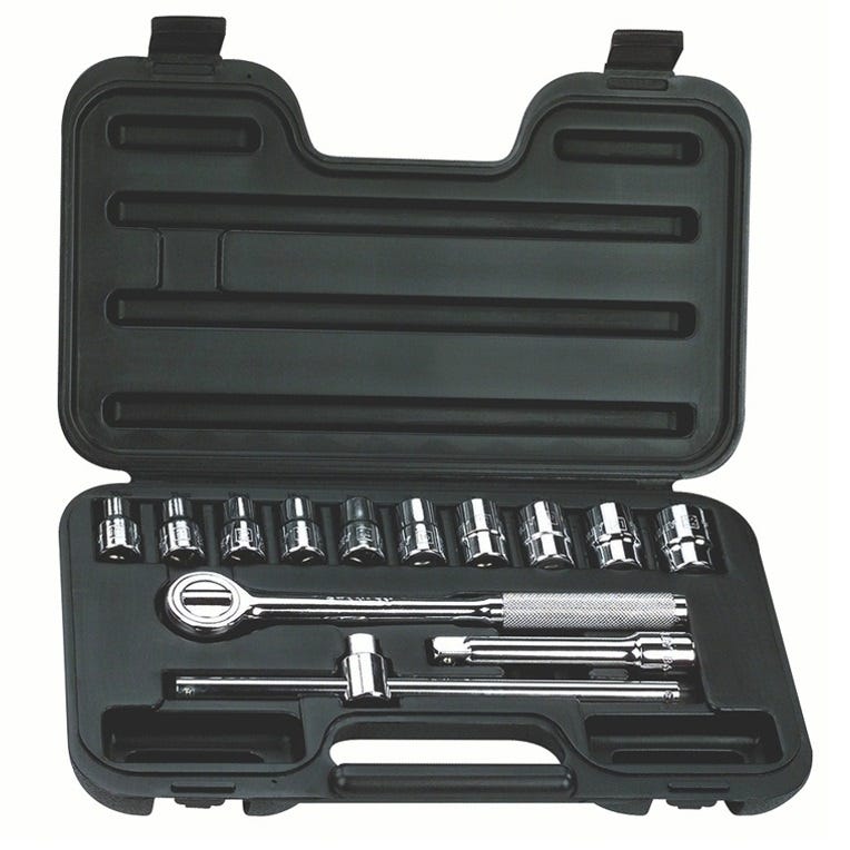 JUEGO DE DADOS []1/2″ DE 14 PIEZAS, CHICHARRA, EXTENSION DE 5″, BARROTE CORREDIZO, 10 DADOS 10-22 MM. Y CAJA