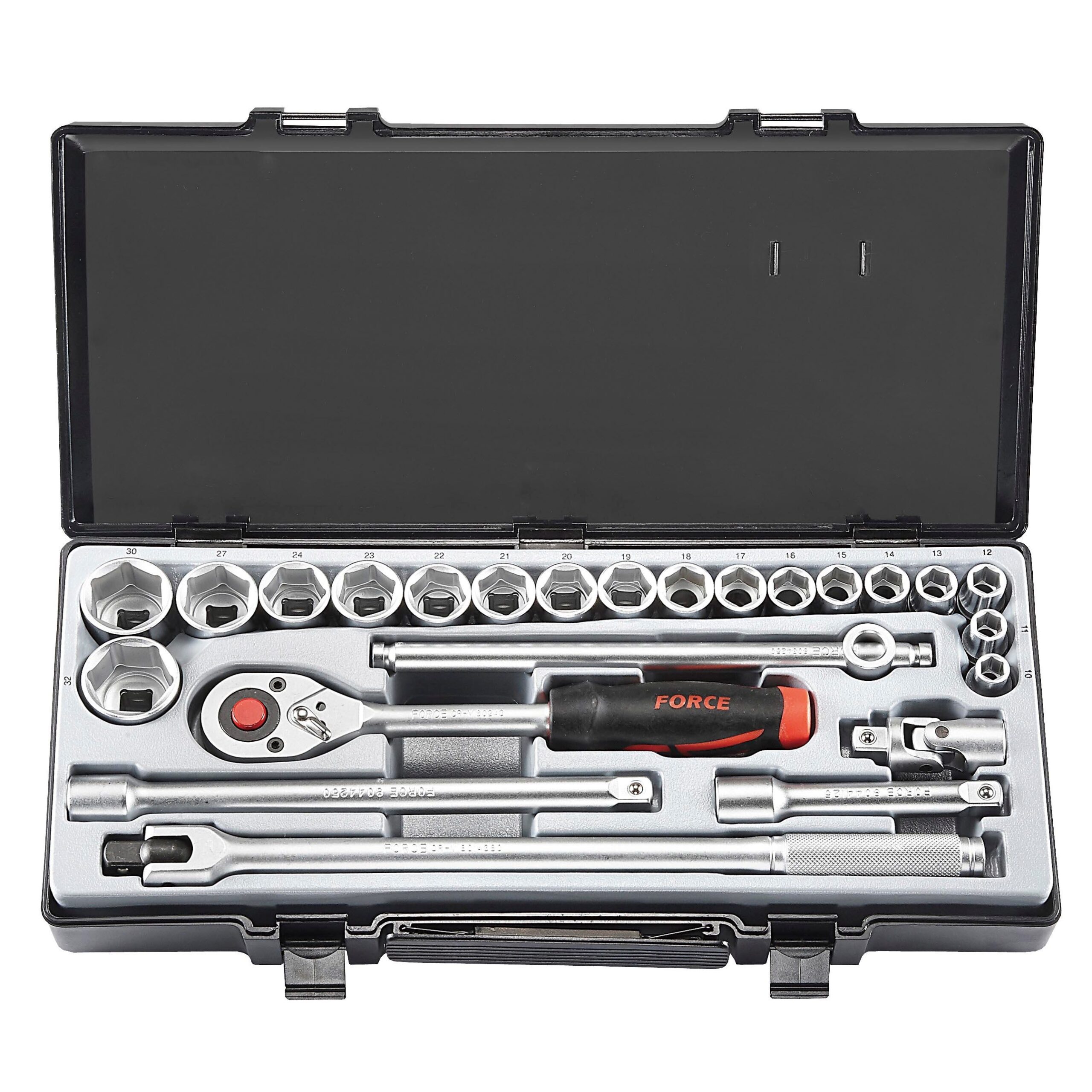 JUEGO DADOS []1/2″ HEXAGONAL, 18 DADOS DE 5/16″ A 1.1/4″, CHICHARRA, BARROTE DE FUERZA, 2 EXTENSIONES 5″-10″, BARROTE CORREDIZO Y CARDAN