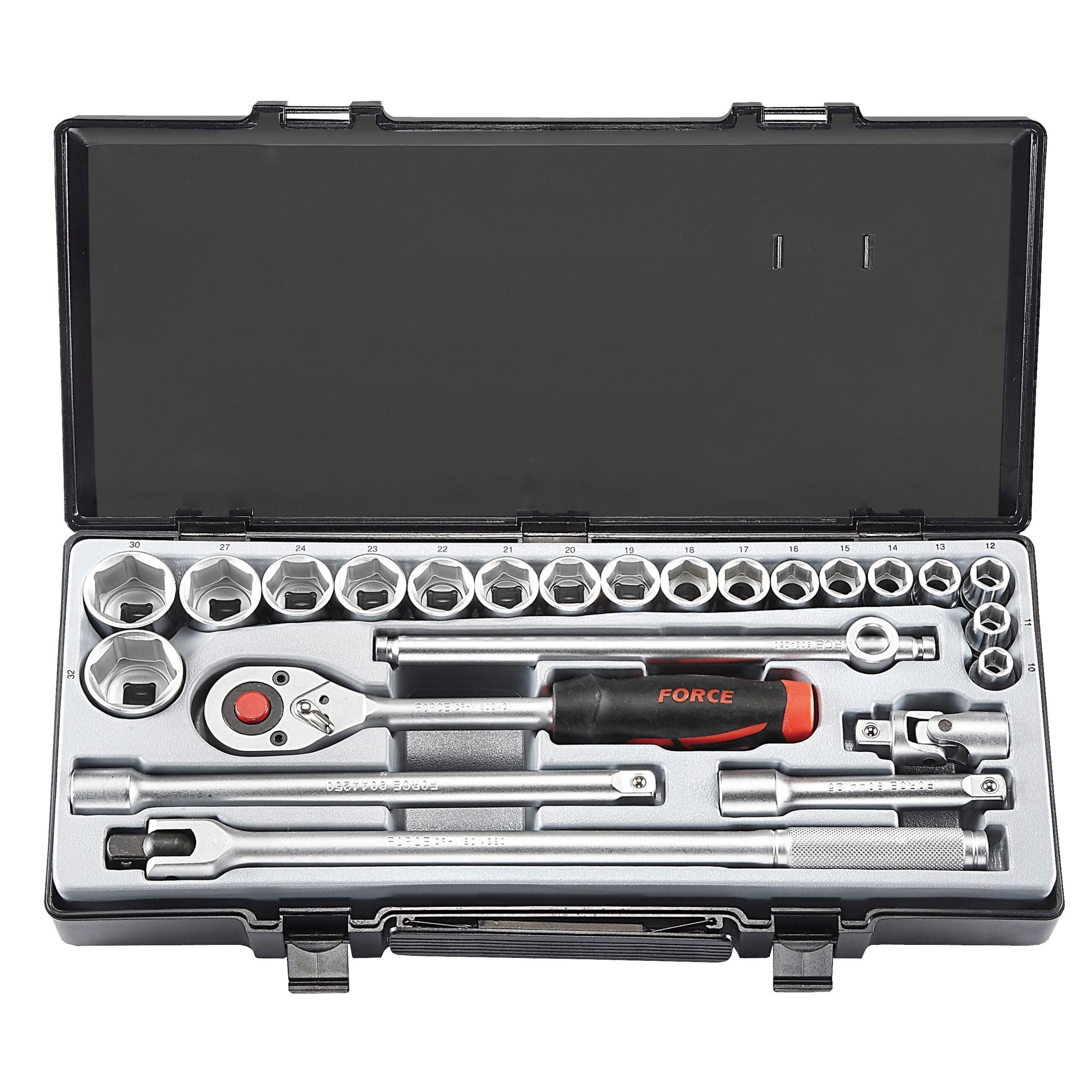 JUEGO DADOS []1/2″ POLIGONAL, 18 DADOS DE 5/16″ A 1.1/4″, CHICHARRA, BARROTE DE FUERZA, 2 EXTENSIONES 5″-10″, BARROTE CORREDIZO Y CARDAN