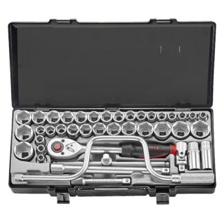 JUEGO DADOS []1/2″, HEXAGONAL, 33 DADOS DE 10 A 32 MM, 3/8″ A 1.1/4″, CHICHARRA, 2 DADOS BUJIA, 2 EXTENSIONES, BARROTE CORREDIZO, CARDAN Y BERBIQUI.