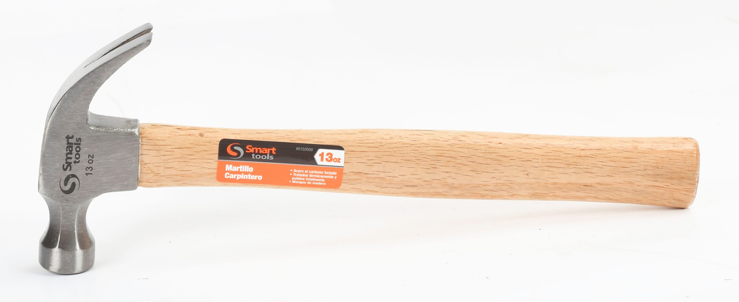 Martillo carpintero 13 Oz, mango de madera, acero al carbono forjado, tratado térmicamente y pulido totalmente / Cabeza forjada en acero al carbono, Mango de madera dura fijado por sistema de cuña, humedad de la madera < 14% , fuerza de tracción: :> 4450 Nm , Dureza cara de golpe : HRC45-60 Fuerza de Garra: HRC40-55