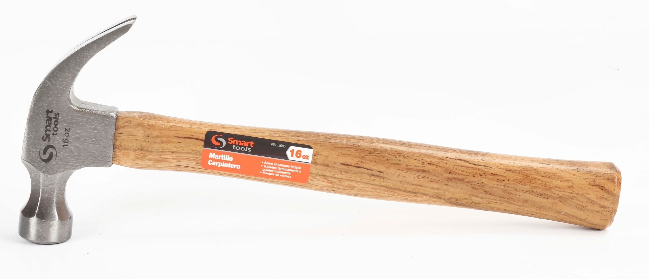Martillo carpintero 16 Oz, mango de madera, acero al carbono forjado, tratado térmicamente y pulido totalmente / Cabeza forjada en acero al carbono, Mango de madera dura fijado por sistema de cuña, humedad de la madera < 14% , fuerza de tracción: :> 4450 Nm , Dureza cara de golpe : HRC45-60 Fuerza de Garra: HRC40-55